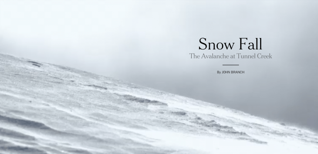 Snow Fall, in italiano La Nevicata, è un progetto giornalistico con cui il New York Times ha chiuso il 2012, vincendo tra l'altro notevoli premi, come l'Online News Association’s Award, l'edizione 2014 degli Online Journalism Awards, nonché il Pulitzer. Un... Continue Reading →